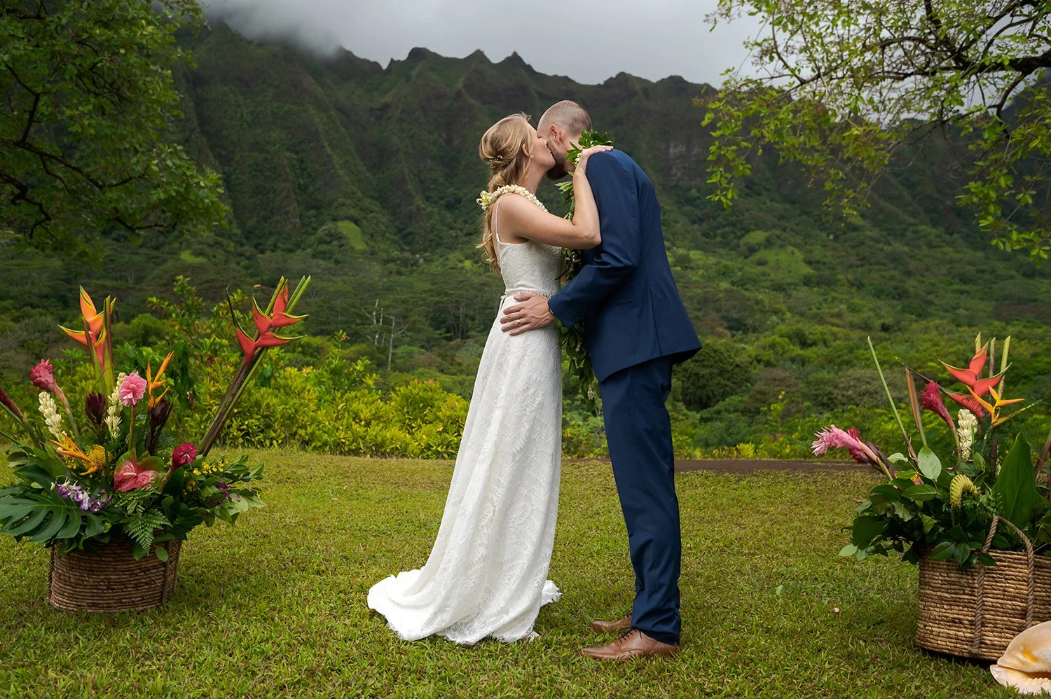 Some close up samples of an actual floral altar set up at Ho’omaluhia. This is the Kahua Nui ceremony location, the spot we use most often for wedding ceremonies in the gardens. On the left we did a full floral backdrop and on the right two large floral baskets. If you’d like to do an arrangement similar to this, please let us know in the floral form (above). We can also do a babies breath circle which is really pretty. Pricing will vary depending on the size/scale of the florals and the type of florals you choose. These types shown below (more traditional Hawaiian florals) are sturdy and hold up well, they’re also tall and brightly colored which looks nice against all the greenery in the mountains. Pricing will vary and we will get you a custom quote upon request.