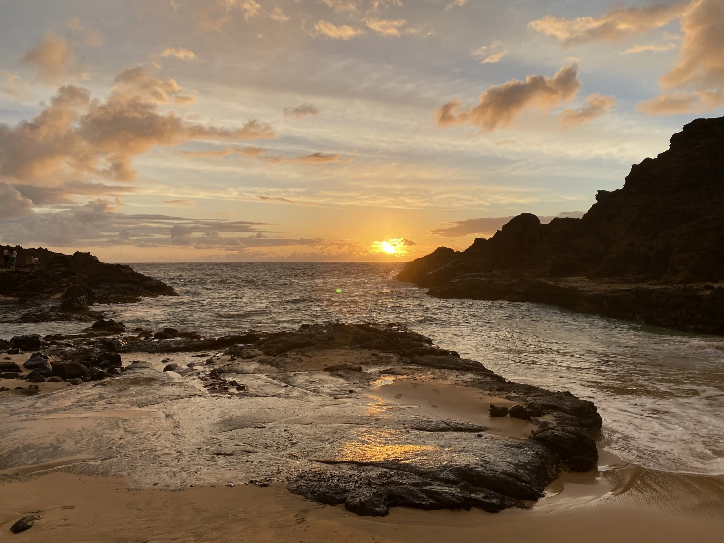 Beach Description: Halona Beach Cove is a beautiful little beach cove located just off the side of a long windy coastal road on the East coast of Hawai’i. It has a small parking lot and can get busy mid day but is beautiful in the earlier morning hours. You will park in the small parking lot and then will need to hike down a steep hill to the little beach cove. The path down will take only about 5-10 minutes and is not too far but is not ideal to do in heels. There is a clear pathway but you must be in decent physical shape and ok with the hike down. This is not the best spot for elderly guests. The beach is a gorgeous white sandy cove with tall black lava rocks surrounding it. You can walk out on to the rocks for even cooler scenery this is an ideal spot to get epic photos. The best times to come are at sunrise or in the earlier morning before it gets crowded and too hot.